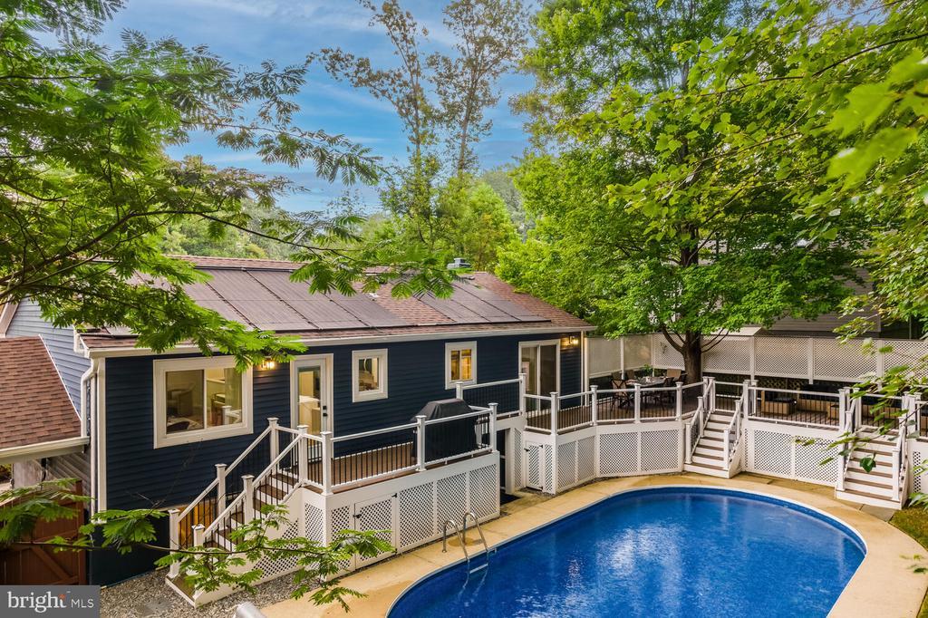 The lower level provides flexible living with two bedrooms, a full bath, and a cozy family room complete with a wood-burning fireplace. Step outside to your own retreat: a sparkling inground pool, **expansive new deck, and large patio** surrounded by mature trees for shade and privacy.